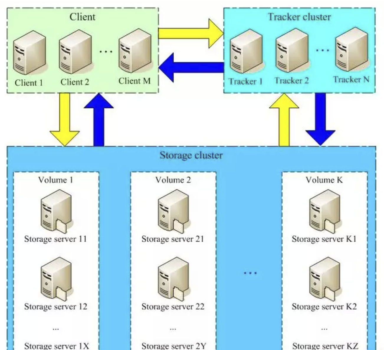 - 存储服务器:即Storage Server。存储服务器顾名思义就是用于存储数据的服务器,主要提供存储容量和备份服务。存储服务器为了保证数据安全不丢失,会多台服务器组成一个组,又称group。同一个组内的服务器上的数据互为备份。