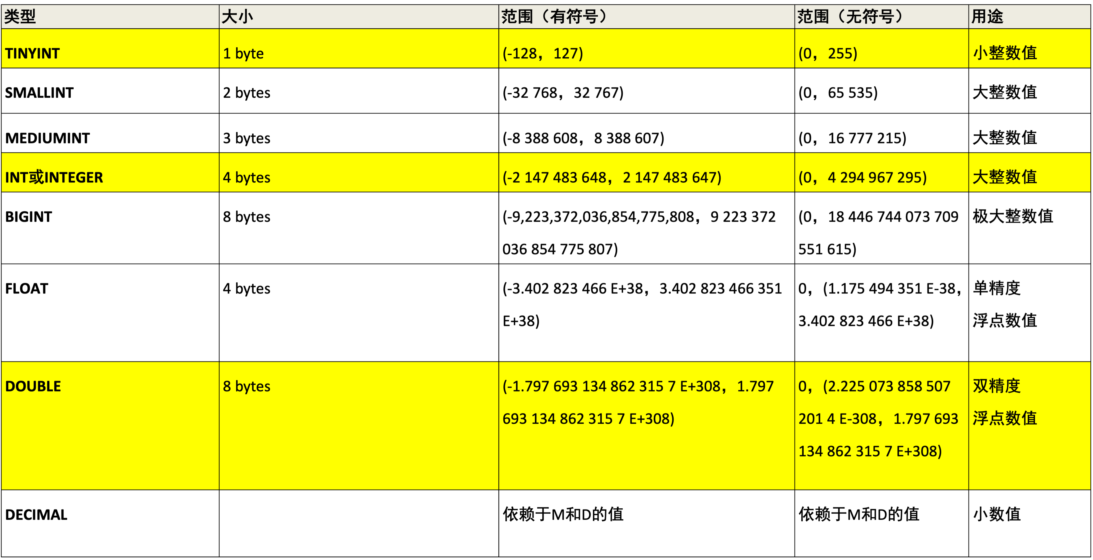 原则:够用就行,尽量使用取值范围小的,而不用大的,这样可以更多的节省存储空间。