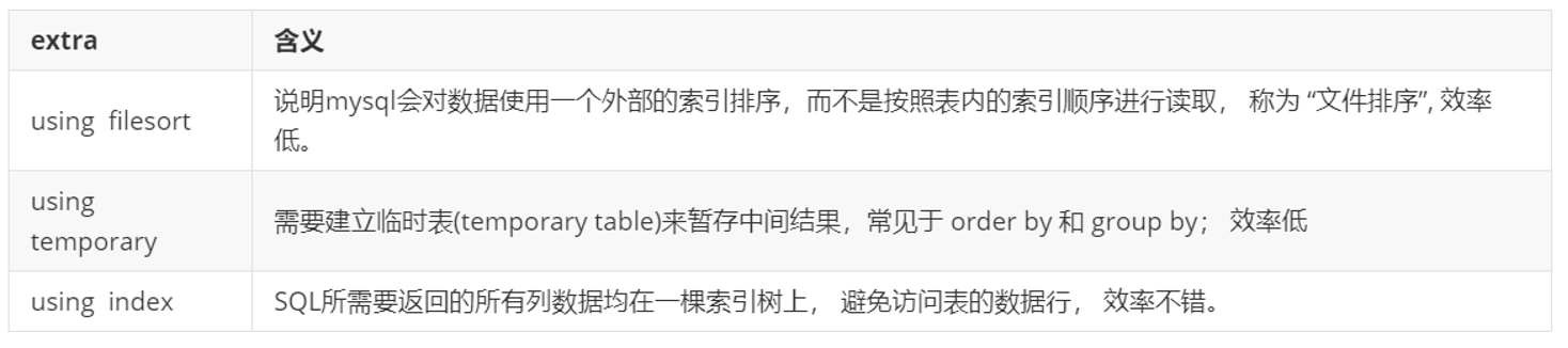 - 第二种通过有序索引顺序扫描直接返回有序数据,这种情况即为 using index,不需要额外排序,操作效率高。